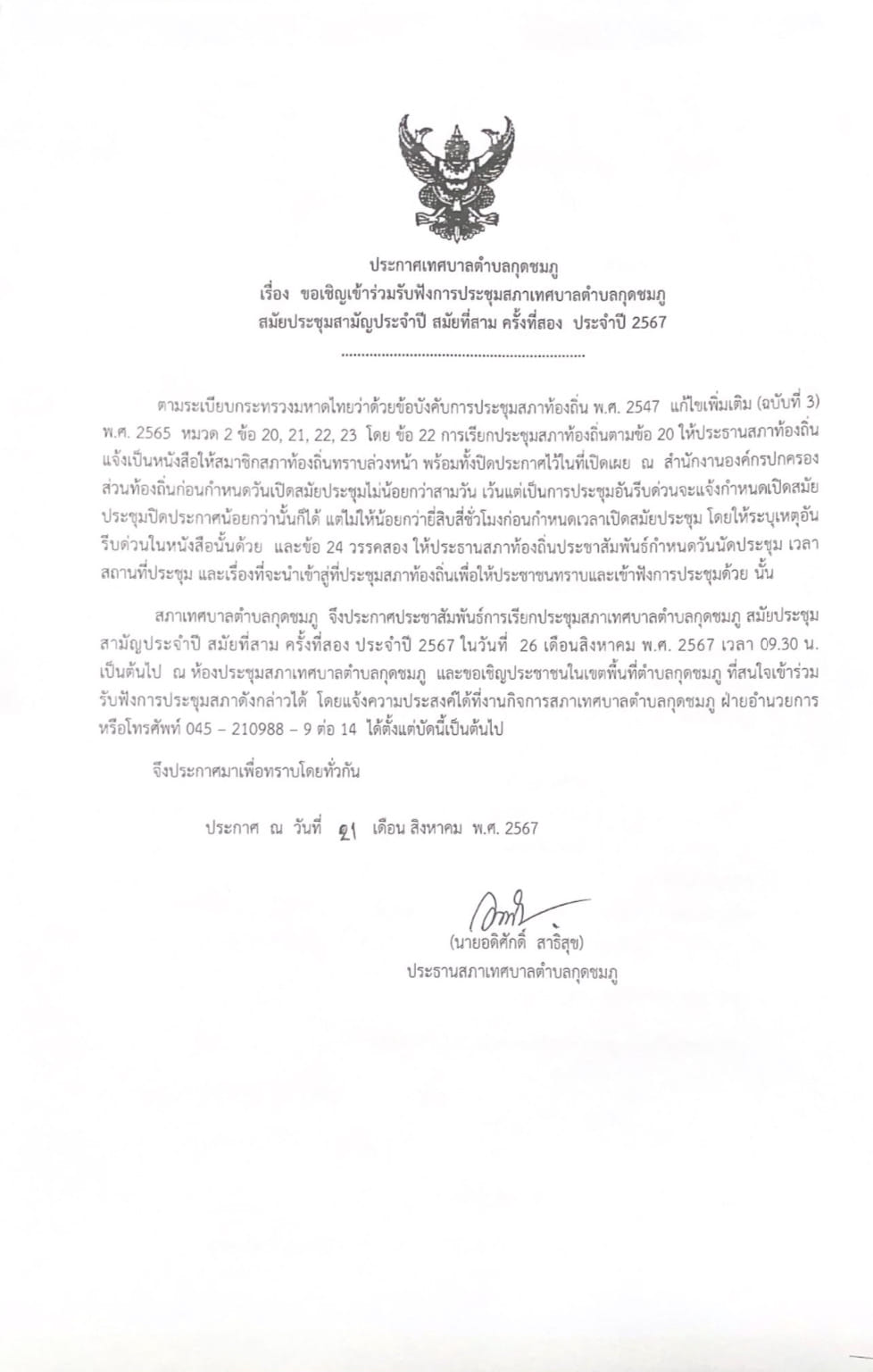 ขอเชิญเข้าร่วมรับฟังการประชุมสภาเทศบาลตำบลกุดชมภู สมัยประชุมสามัญประจำปี สมัยที่สาม ครั้งที่สอง ประจำปี 2567
