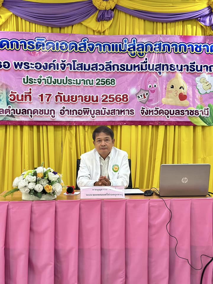 วันที่ 17 กันยายน พ.ศ.2568 เวลา 09.00 น.นายบุญธรรม พรมดี รองนายกเทศมนตรีตำบลกุดชมภู เป็นประธานเปิดโครงการช่วยลดการติดเอดส์จากแม่สู่ลูกสภากาชาดไทยพระเจ้าวรวงศ์เธอพระองค์เจ้าโสมสวลีกรมหมื่นสุทธนารีนาถ ประจำปีงบประมาณ 2568 โดยมีคณะผู้บริหารเทศบาลฯ สมาชิกสภาเทศบาลฯ และผู้ใหญ่บ้าน ผู้ช่วยผู้ใหญ่บ้านตำบลกุดชมภู ร่วมเป็นเกียรติในโครงการดังกล่าว โดยมีวัตถุประสงค์ เพื่อป้องกันการติดโรคเอดส์จากแม่สู่ลูก และป้องกันโรคทางเพศสัมพันธ์ ลดพฤติกรรมความเสี่ยง ให้ปลอดภัยจากโรคเอดส์ และโรคติดต่อทางเพศสัมพันธ์ สามารถใช้ชีวิตให้มีความสุขในการดำรงชีวิต อยู่ในสังคมอย่างมีความสุข อย่างยั่งยืนต่อไป ณ ห้องประชุมเทศบาลตำบลกุดชมภู อำเภอพิบูลมังสาหาร จังหวัดอุบลราชธานี