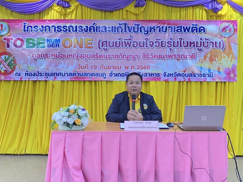 วันที่ 19 กันยายน พ.ศ.2568 เวลา 09.00 น.นายมงคล ศุภสุข นายกเทศมนตรีตำบลกุดชมภู เป็นประธานเปิดโครงการ รณรงค์และแก้ไขปัญหายาเสพติด (To Be Number One )ศูนย์เพื่อนใจวัยรุ่นในหมู่บ้าน) ทูลกระหม่อมหญิงอุบลรัตนราชกัญญา ศิริวัฒนาพรรณวดี ประจำปี 2568 โดยมีคณะผู้บริหารเทศบาลตำบลกุดชมภู สมาชิกสภาเทศบาลฯ และผู้ใหญ่บ้านตำบลกุดชมภู ร่วมเป็นเกียรติในโครงการครั้งนี้ โดยมีวัตถุประสงค์ เพื่อสร้างเกราะป้องกันที่เข้มแข็ง แก้ไขปัญหายาเสพติดในเยาวชน ณ ห้องประชุมเทศบาลตำบลกุดชมภู อำเภอพิบูลมังสาหาร จังหวัดอุบลราชธานี