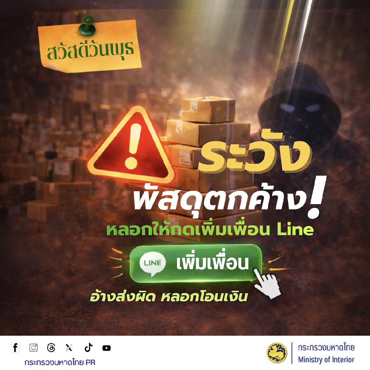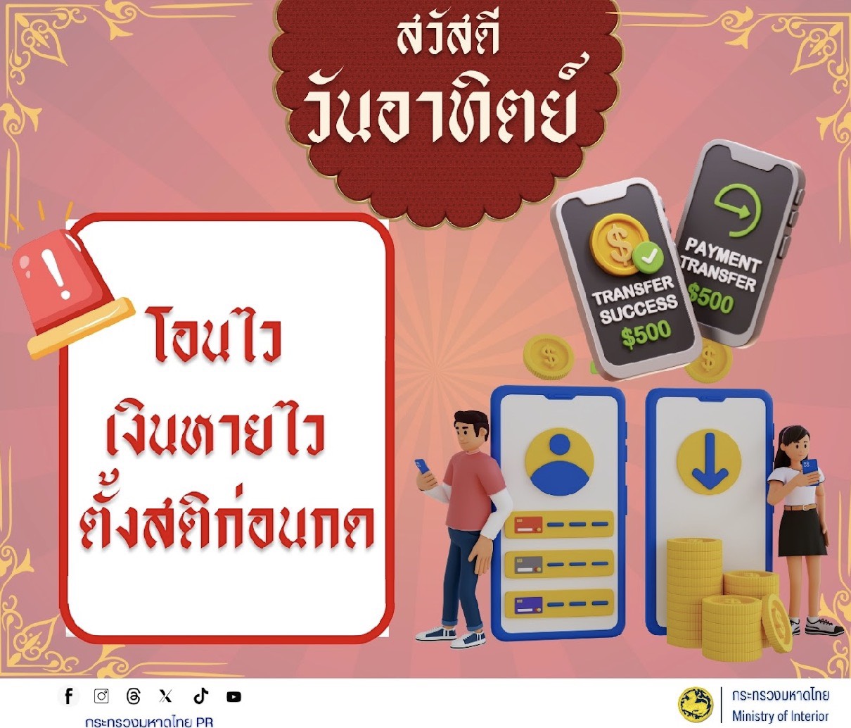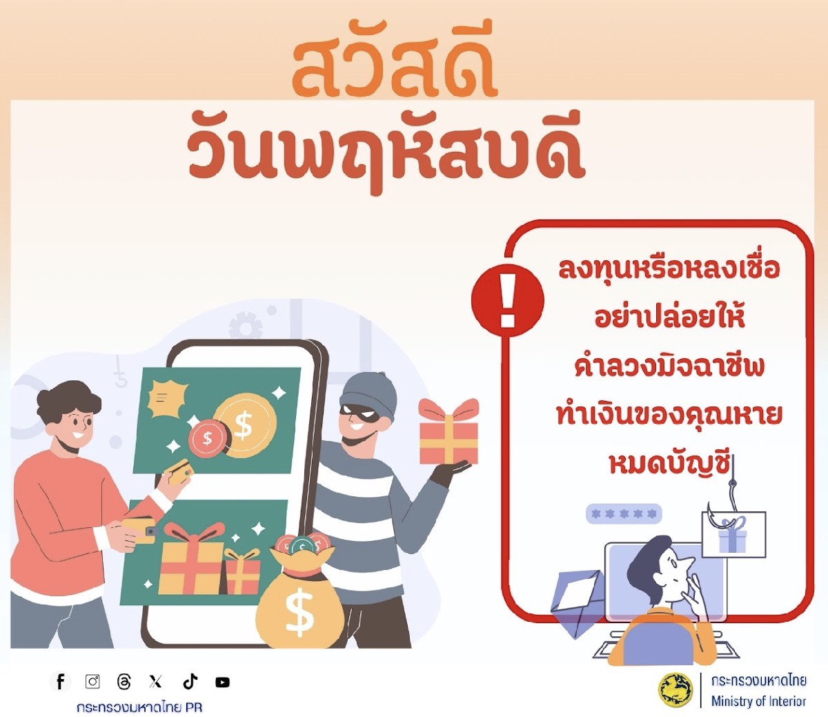 #ขอประชาสัมพันธ์การสร้างความรู้ความเข้าใจเพื่อป้องกันการหลอกลวงทางออนไลน์( Scammer) การป้องกันปัญหาอาชญากรรมทางไซเบอร์การพนันทุกรูปแบบและการหลอกลวงประชาชน"ไม่เชื่อไม่รีบไม่โอน #ไม่เชื่อ ตั้งสติอย่าหลงเชื่อคำขู่หรือข้อเสนอที่ดีเกินจริงจากคนไม่รู้จัก #ไม่รีบ ตรวจสอบข้อมูลกลับหน่วยงานที่ถูกอ้างถึงโดยตรงก่อนตัดสินใจ #ไม่โอน ห้ามโอนเงินให้บัญชีที่ไม่รู้จักหรือยังไม่ได้ตรวจสอบเด็ดขาด