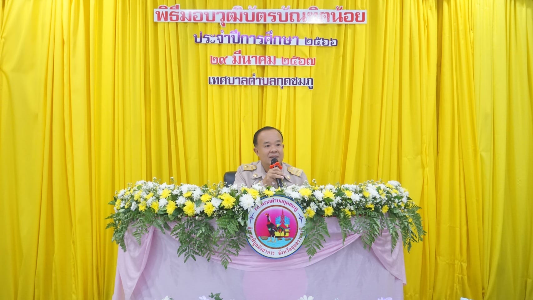 วันที่ 29 มีนาคม พ.ศ. 2567 เวลา 09:00 น. นายมนตรี ศรีคำภา นายกเทศมนตรีตำบลกุดชมภู เป็นประธานในพิธีมอบวุฒิบัตร บัณฑิตน้อย สำหรับผู้สำเร็จการศึกษา ประจำปี 2566 จากศูนย์พัฒนาเด็กเล็กในสังกัดเทศบาลตำบลกุดชมภู จำนวน 56 คน พร้อมคณะผู้บริหารฯ สมาชิกสภาเทศบาลฯ โดยมีนายอภิชาติ เศรษฐมาตย์ ปลัดเทศบาลตำบลกุดชมภูเป็นผู้กล่าวรายงานวัตถุประสงค์ของโครงการฯ พร้อมด้วยผู้อำนวยการกอง หัวหน้าฝ่าย พนักงาน เจ้าหน้าที่เทศบาลตำบลกุดชมภู ร่วมแสดงความยินดีและให้กำลังใจกับบัณฑิตน้อยในครั้งนี้ ณ ห้องประชุมเทศบาลตำบลกุดชมภู อำเภอพิบูลมังสาหาร จังหวัดอุบลราชธานี