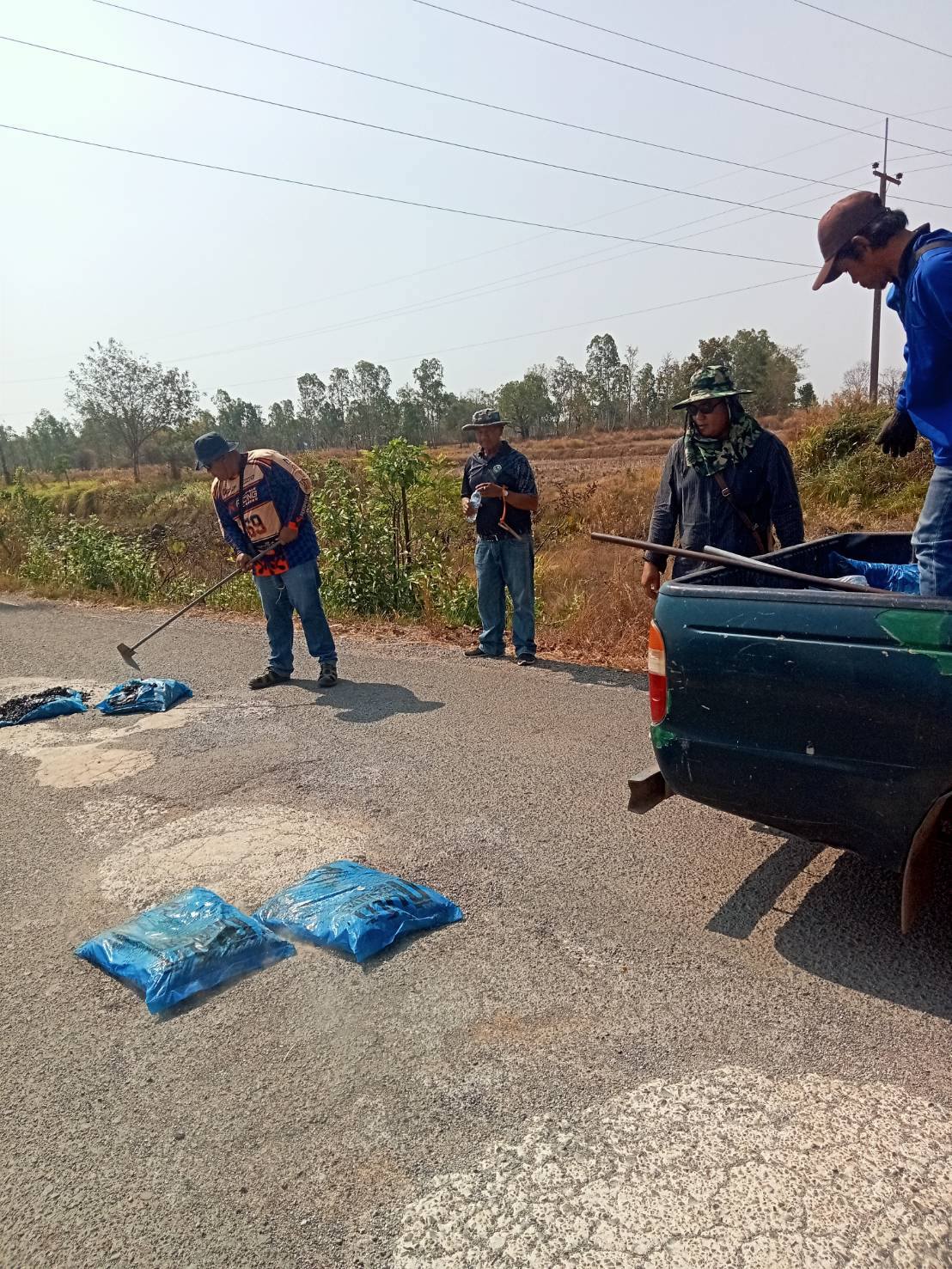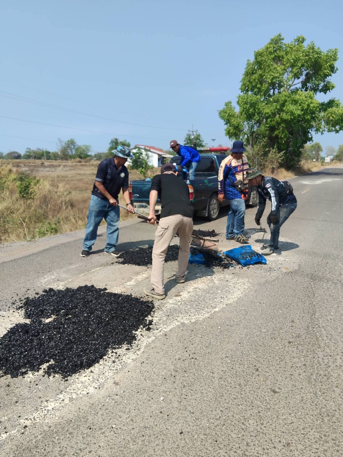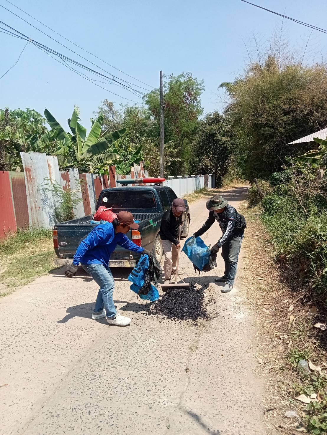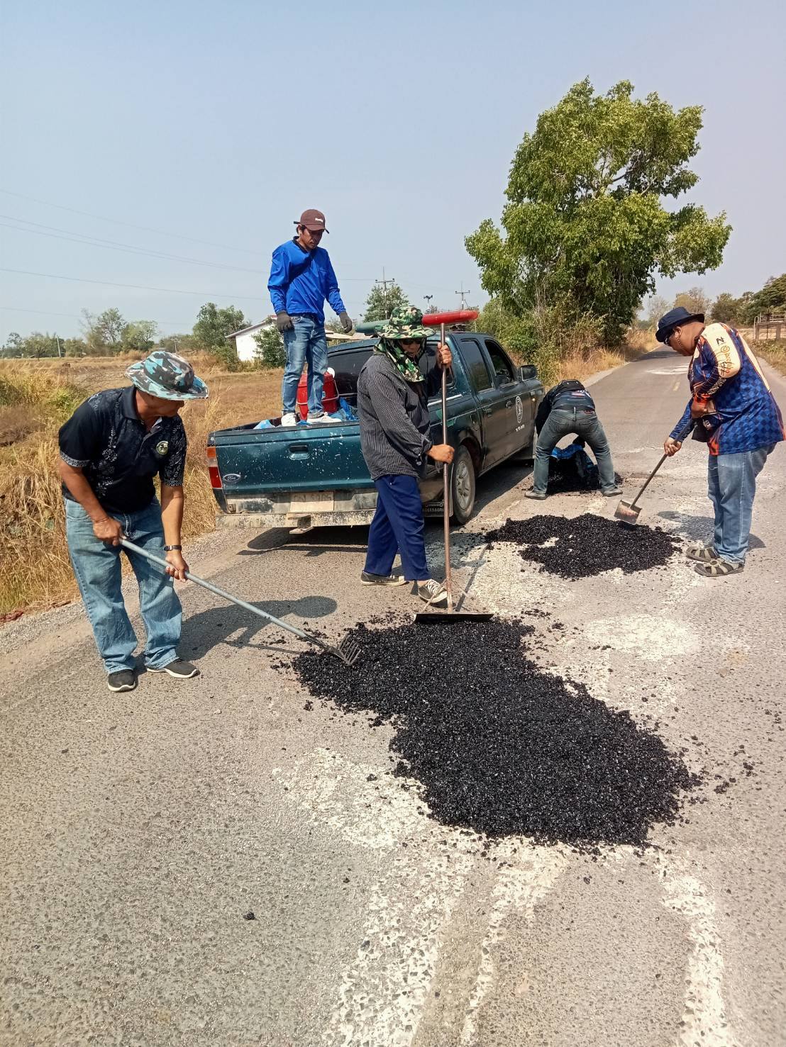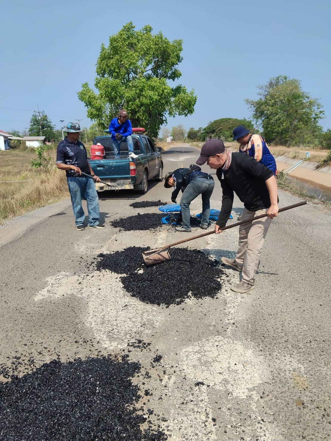 กุดชมภู พนักงานเจ้าหน้าที่ เทศบาลตำบลกุดชมภูร่วมพัฒนานำยางมะตอยไปปิดหลุมที่เป็นหลุมเป็นบ่อ เส้นถนนบ้านโนนโพธิ์
